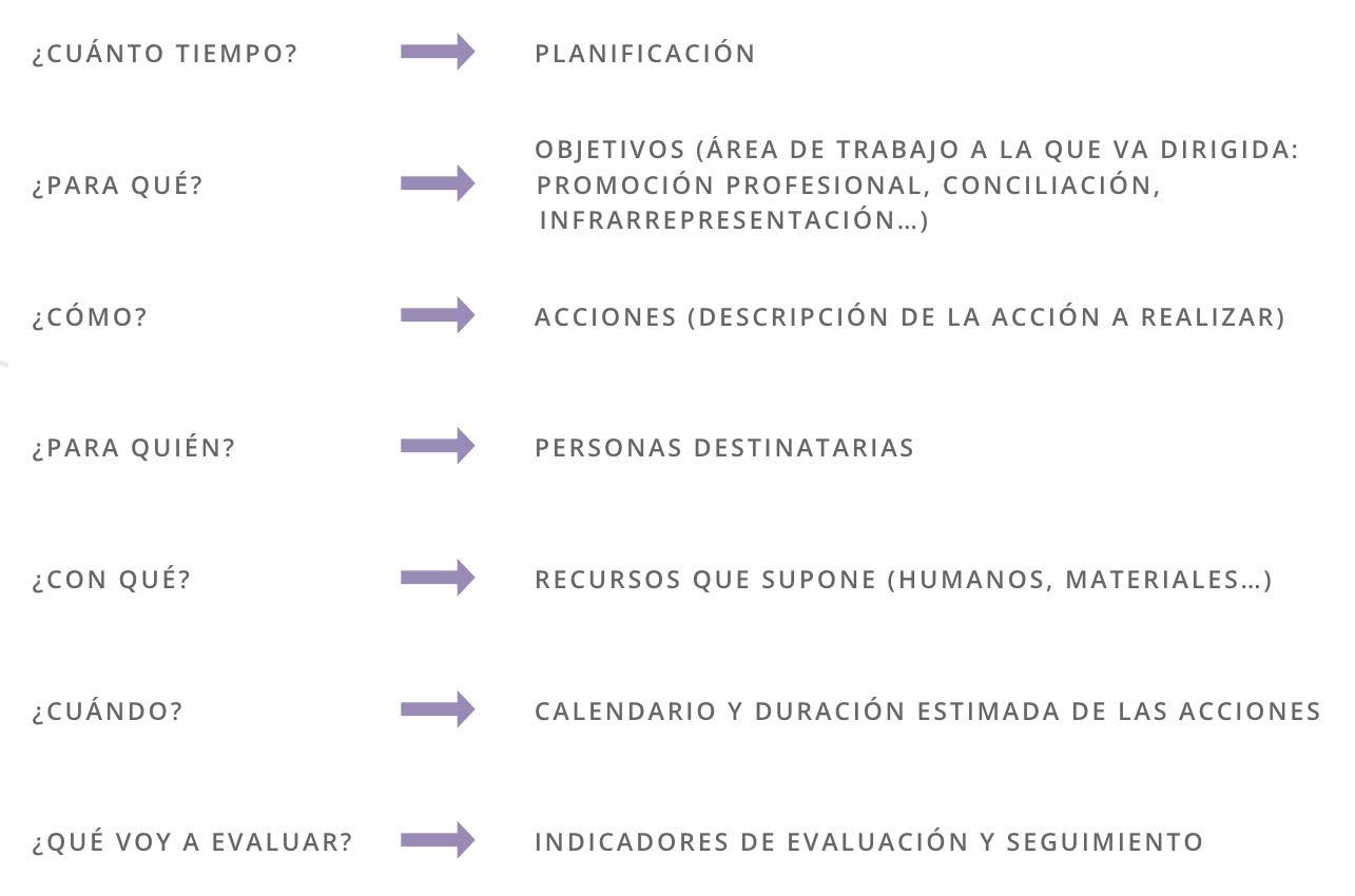 | ¿Para qué? | Objetivos (área de trabajo a la que va dirigida: promoción profesional, conciliación, infrarrepresentación…) | |
